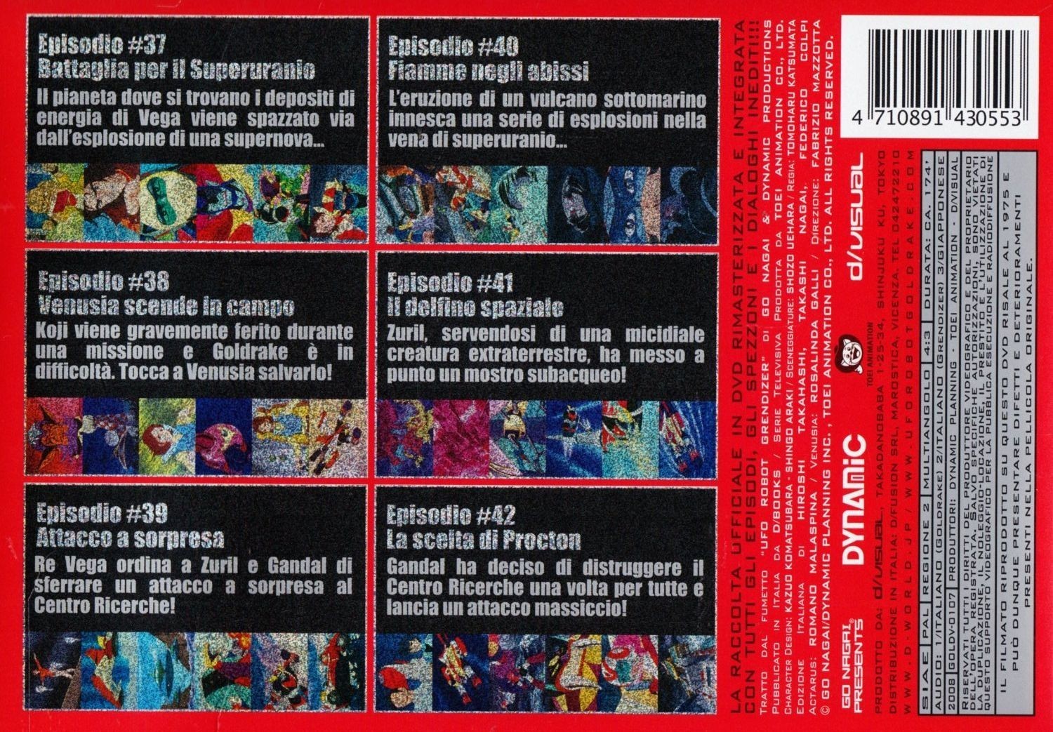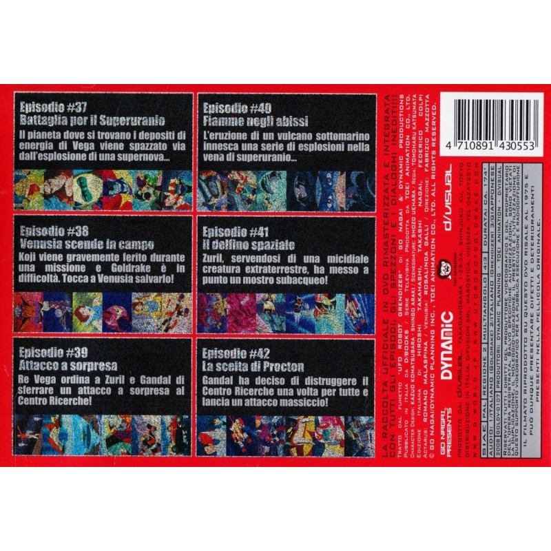 E le sorprese non finiscono qui, perche' i DVD presentano una FUNZIONE MULTIANGOLO in corrispondenza delle sigle di inizio, di quelle di coda e delle anticipazioni (presentate per LA PRIMA VOLTA in Italia!), attraverso la quale e' possibile vedere sia l'edizione con i titoli italiani che quella con i titoli giapponesi! A corredare il tutto vengono le bellissime e indimenticate voci dei doppiatori originali dell'epoca, da Romano Malaspina - Actarus a Rosalinda Galli - Venusia, e le mitiche sigle "Ufo Robot" (Si trasforma in un razzo missile...) e "Goldrake" (Vai, distruggi il male, vai...) nell'edizione originale degli Actarus! E contemporaneamente parte anche il ricchissimo sito www.uforobotgoldrake.com dedicato solo ed esclusivamente al nostro eroe! Cosa volere di piu'?! In questo numero sono inclusi i seguenti episodi: