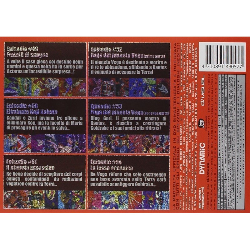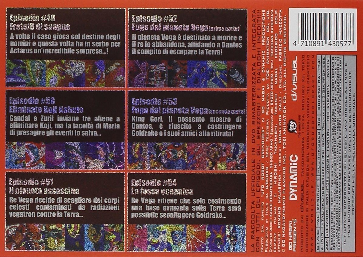 E le sorprese non finiscono qui, perche' i DVD presentano una FUNZIONE MULTIANGOLO in corrispondenza delle sigle di inizio, di quelle di coda e delle anticipazioni (presentate per LA PRIMA VOLTA in Italia!), attraverso la quale e' possibile vedere sia l'edizione con i titoli italiani che quella con i titoli giapponesi! A corredare il tutto vengono le bellissime e indimenticate voci dei doppiatori originali dell'epoca, da Romano Malaspina - Actarus a Rosalinda Galli - Venusia, e le mitiche sigle "Ufo Robot" (Si trasforma in un razzo missile...) e "Goldrake" (Vai, distruggi il male, vai...) nell'edizione originale degli Actarus! E contemporaneamente parte anche il ricchissimo sito www.uforobotgoldrake.com dedicato solo ed esclusivamente al nostro eroe! Cosa volere di piu'?! In questo numero sono inclusi i seguenti episodi: